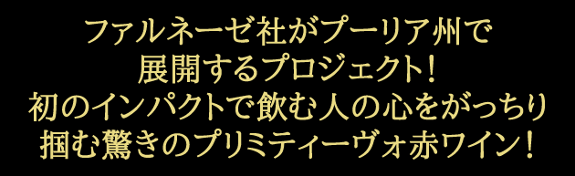 ファルネーゼグループがプーリアで展開する新たなプロジェクトです。エノロゴはファルネーゼのフィリッポバッカラーロが務めています。畑は大部分が、マンドゥーリアとサーヴァの町にあり、フィリッポと何年にも渡って一緒に仕事をしてきた農家が所有しているものです。