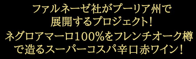 ファルネーゼグループがプーリアで展開する新たなプロジェクトです。エノロゴはファルネーゼのフィリッポバッカラーロが務めています。畑は大部分が、マンドゥーリアとサーヴァの町にあり、フィリッポと何年にも渡って一緒に仕事をしてきた農家が所有しているものです。