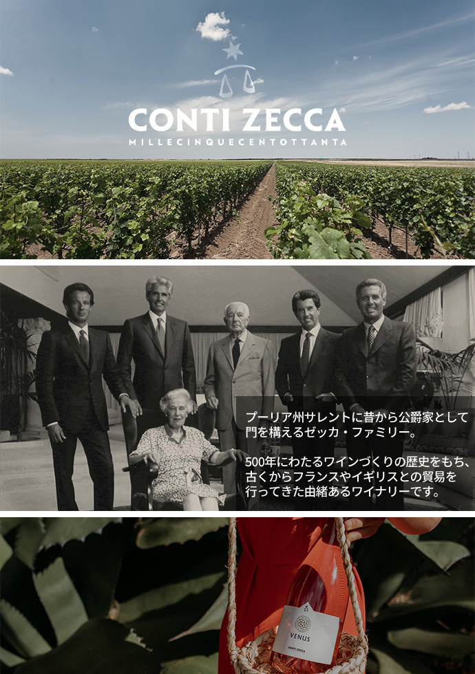 プーリア州サレントに昔から公爵家として門を構えるゼッカ・ファミリー。500年にわたるワインづくりの歴史をもち、古くからフランスやイギリスとの貿易を行ってきた由緒あるワイナリーです。現在のワイナリーは、より高い品質のワインづくりを目指し、アルチビアーデ・ゼッカにより1985年に設立されたもの。320haの自社畑からは、年間約200万本にのぼるワインが生産されています。南の地ならではの土着品種の魅力を最大限に生かし、広大な自社畑だからこそなせる、安定感のある優れた品質と価格のバランスがとれたワイン造り。コンティ・ゼッカはまさにプーリアにおいて次世代のリーダーとなる存在です。1998年から6年連続でトレビッキエーリを取り続けた、フラッグ・シップの「ネロ」が、そのことを何よりも証明してくれます。