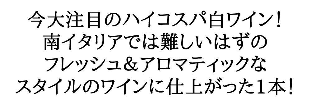 イル プーモ マルヴァジーア ソーヴィニヨン 2024 カンティーネ サン マルツァーノ 750ml ソーヴィニヨン・ブラン種とマルヴァジーア・ビアンカで造られるハイコスパイタリア辛口白ワイン。フレッシュな酸味とたっぷりの果実味を得るために、収穫のタイミングを分けるこだわり!南イタリアでは難しいはずのフレッシュ&アロマティックなスタイルのワインに仕上がった1本。柑橘系果実とハーブの爽やかな香り。口中ではフレッシュかつフルーティな味わいが広がり、酸味とミネラルが豊かで飲み飽きしない白ワインです。