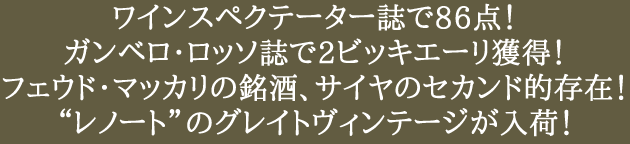 シチリア島 南東部の美しい村、ノト。モレッティ氏は2001年にそこのワイナリー FEUDO MACCARI フェウド マッカリを含めた畑(100ha)を購入しました。トスカーナでのワイン造りと同じように、有名醸造家カルロ フェリーニを招き、ワインを造りました。シチリアの固有品種ネーロダーヴォラ100%で造られるサイアは2002年が初ビンテージです。雨が少ないシチリアでとても重要な働きを持つ“運河"を意味するサイア(SAIA)。恵まれた天候だが 問題は乾燥で50cm地下に灌漑設備を設置しています。カルシウム分が多い火山性の黒土から生まれるネーロダーヴォラを10ヶ月間樽熟させます。(50%フランス アリエ産の新樽使用。)
