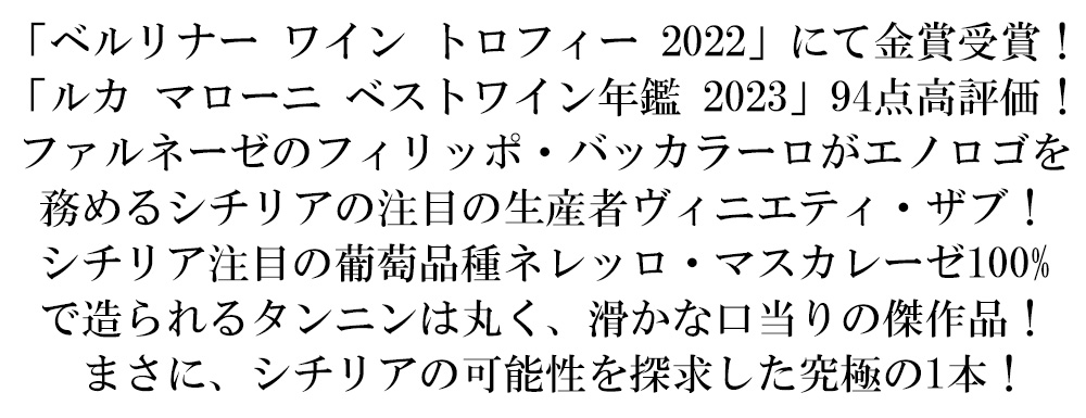 大人気ファルネーゼの傘下であり、ファルネーゼのフィリッポ・バッカラーロがエノロゴを務めるシチリア注目の生産者!ルカ・マローニ誌の評価が高い造り手としても定評!