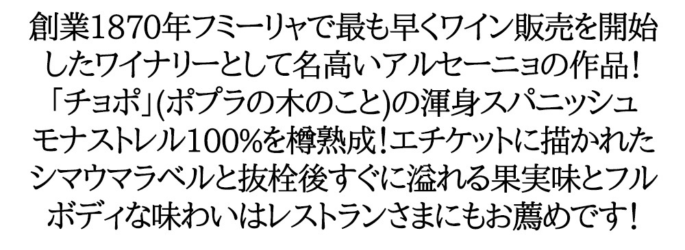 「チョポ」(ポプラの木のこと)は、創業1870年、フミージャで最も早くワイン販売を開始したワイナリーとして名高い「アルセーニョ」の作品で、標高800メートルの完全無農薬栽培の畑で育まれたモナストレル(ムールヴェードル)を100%使用した、オーガニック・ワインです。