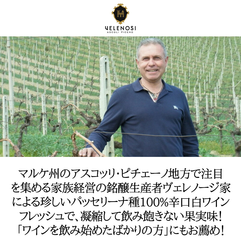 イタリア・マルケ州のアスコッリ・ピチェーノ地方で注目を集める家族経営の生産者ヴェレノージ家!あのロバート・パーカー氏も「マルケ南部のリーダー的生産者となりつつあることを確信している」と大注目!の白ワインの品質の向上が著しい生産者ヴェレノージ社による珍しいパッセリーナ種100%の辛口白ワイン!畑はアスコリ・ピチェーノにあり、海抜200~300m!何もしないと収量が多くなってしまうので、品質をあげるために、厳しく収穫量を制限!収穫は、9月半ばに早朝か夕方に手で行い、小さな冷蔵ケースでセラーまで運びます!収穫された葡萄を選別!柔らかく圧搾した後、急速に冷却して、不純物などを除きます!温度管理の出来るスチールタンクで13~15度に保ち発酵!