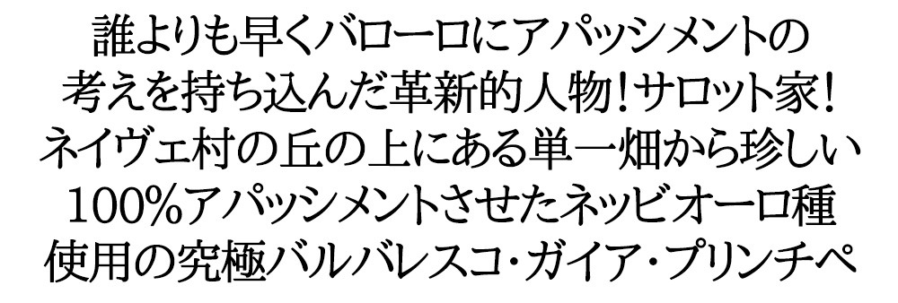 ロベルト・サロットのこのガイア・プリンチペは、ネイヴェ村の丘の上にある単一畑で畑は南から南西向きで2ha、海抜270m!