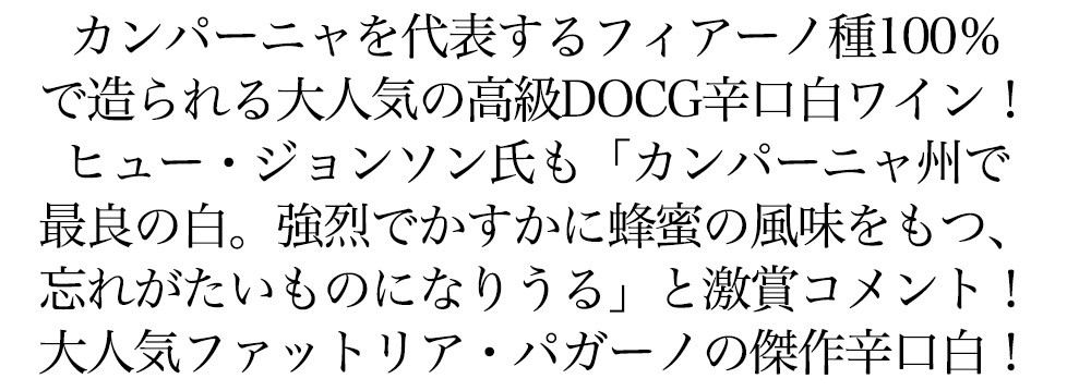 フィアーノ ディ アヴェッリーノ [2022]年 ぶどう品種:フィアーノ種100% カンパーニャを代表するフィアーノ種100%で造られる人気DOCG辛口白ワイン!グレコ・ディ・トゥーフォとともに、ヴィンテージ2003からD.O.C.G.に昇格した、カンパーニア州を代表する白ワイン、フィアーノ ディ アヴェッリーノDOCG! ラテン語のApiane「蜂に好まれるぶどう」を語源とするフィアーノ種は、甘く、香り豊かなぶどう品種で、このフィアーノ種を100%使用したワインです。 葡萄の仕立てはグイヨ、植栽密度 5,200 本/haです。収穫は10月中旬か ら下旬に選別しながら手摘み100%で行います。 発酵はステンレスタンクで行い、熟成もステンレスタンクで 4 ヶ月行います。 ワインは輝きのあるグリーンがかった黄色、熟れた洋なしや野の花や桃の花のエレガントなアロマ、ローストし たヘーゼルナッツの凝縮感のある香りが感じられます。 フレッシュな味わいの中にミネラ ルの要素も感じられる人気辛口白ワイン。