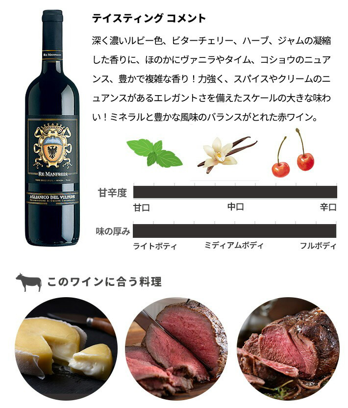 バジリカータ州はイオニア海に面し、プーリア州とカンパーニア州の間に位置しています。バジリカータでもっとも需要なブドウ品種は、アリアニコ。古代ローマ人に称えられたアリアニコの名は、通称「ヘレーニカ」とよばれたオリエント産の台木に由来するといわれています。当時からこのブドウを使用し、有名なワインが造られており、現在では、辛口でベルベットのようなソフトな口当たりの長期熟成に向く赤ワインが造られています。