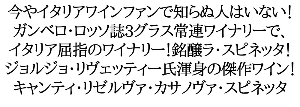 キャンティ リゼルヴァ カサノヴァ ラ スピネッタ 2020年 ■ぶどう品種:サンジョヴェーゼ100% スピネッタ社の希少キアンティ!ガンベロ・ロッソ誌3グラス常連ワイナリーで、イタリア屈指のワイナリー!ガンベロ・ロッソ誌“ワイナリー・オブ・ザ・イヤー”に輝き、今や、イタリアワインファンで知らぬ人はいない!ラ・スピネッタのジョルジョ・リヴェッティーが!ラ・スピネッタ“初”のキアンティ・リゼルヴァDOCGをリリース!なんと!2013年のキャンティ・リゼルヴァ・カサノヴァでワインアドヴォケイト誌驚異の91点(今-2026年)獲得! トスカーナ州テッリチョーラの海抜250mにある、カサノーヴァの南向きの10haの畑の、樹齢20年のサンジョヴェーゼ100%を、ミディアム・ローストのフレンチオーク樽100%でなんと、驚異の24ヶ月熟成!さらにステンレスタンクで20ヶ月、さらに瓶内熟成6ヶ月の計40ヶ月熟成!の長い熟成の後、ようやくリリース!