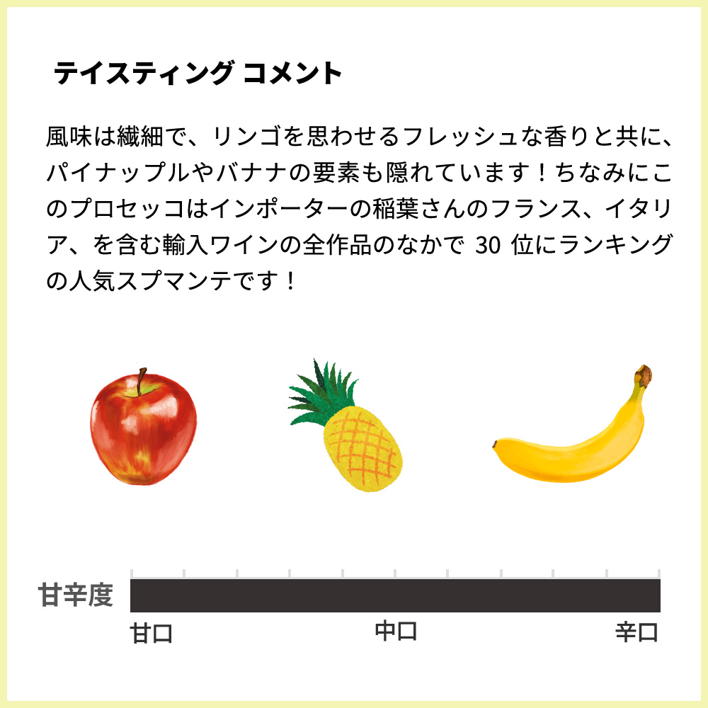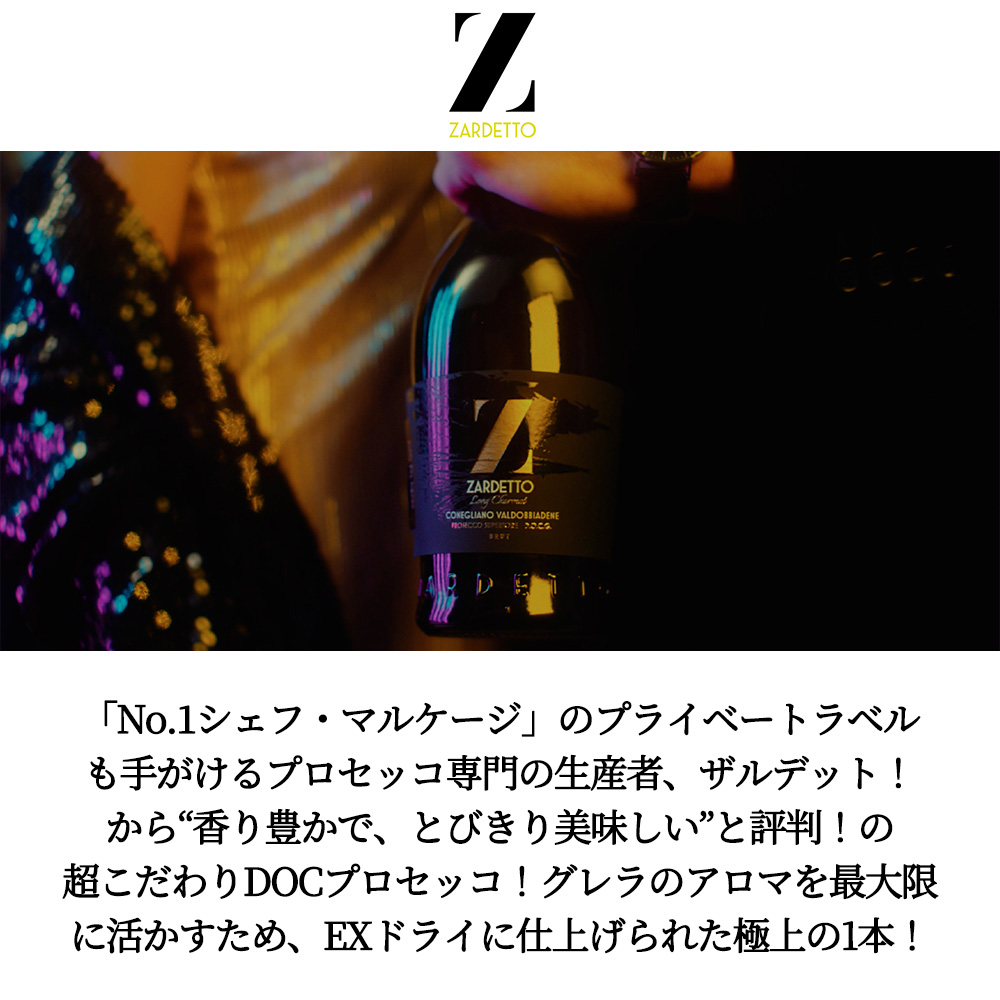 「No.1シェフ・マルケージ」のプライベートラベルも手がけるプロセッコ専門の生産者、ザルデット!から“香り豊かで、とびきり美味しい”と評判の超こだわり!DOCプロセッコ!グレラのアロマを最大限に活かすため、エクストラ ドライに仕上げられた極上の1本!グレラは、僅かな残糖の違いで色々なアロマが出せる葡萄で、エクストラ・ドライ(残糖12~17g/L)は、最もアロマティックでフルーティなプロセッコになります!