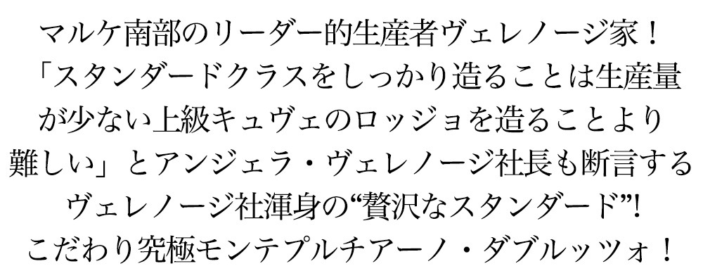 モンテプルチアーノ・ダブルッツォ[2022]年・ヴェレノージ社 ■ぶどう品種:モンテプルチャーノ100% ■収穫:9月中旬~10月 ■発酵、醸し:約20日間 ■熟成:ステンレスタンク イタリア三大評価誌ですべて満点獲得の“ロッジョ・デル・フィラーレ”で特に有名なヴェレノージ社(エントリークラスからトップ・キュヴェまで全てのワインに同じ労力をかけるそうした姿勢が実り、国際的なコンペティションでも高く評価されています)がアブルッツオで造る人気ワイン! 紫がかったルビーレッド!スグリやイチゴ、ラズベリーを思わせる香り。ボリュームのあるフルーティなボディがあり、とてもなめらかな口当たり。 このスタンダードクラスをしっかり造ることは、生産量が少ない上級キュヴェのロッジョを造ることより難しいと言います。