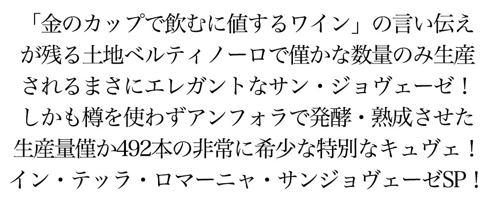 イタリア・エミリア・ロマーニャ辛口フルボディ赤ワイン愛好家大注目!「金のカップで飲むに値するワイン」の言い伝えが残る土地、ベルティノーロで僅かな数量のみ生産されるエレガントなサンジョヴェーゼ!しかもアンフォラで発酵・熟成させた生産量わずか492本のみの特別なキュヴェ!造り手は「エミリア・ロマーニャ州の南部にある家族経営のカンティーナ」テヌータ・ラ・ヴィオラ!1998年にエミリア・ロマーニャ州の南に位置するベルティノーロ(「ベルティノーロ(Bertinoro)という土地の名前の由来」は言い伝えによると「ローマ皇帝の娘がこの地にやってきた際、粗末なグラスでワインを出された。それを飲んだ彼女はワインの素晴らしさを讃えて、このワインは金のグラスで飲む(berti in oro)に値すると言った」ことに由来しています)で設立されました!11haの畑を所有し、ステファーノ・ガベリーニとその家族によってワイン造りが行われています!また2000年からジュゼッペ・カヴィオラがコンサルティングを行っています。カヴィオラのワインのスタイルがエレガンス、バランスを大切するというステファーノ・ガベリーニが求めているものと同じ方向性だったからです!このワインは「樽を使わずにどれだけサンジョヴェーゼのポテンシャルを引き出せるかを証明したい」という思いから造られました。しかもアンフォラで発酵・熟成させた生産量わずか492本のみ特別なキュヴェ!(日本への入荷はわずか260本のみ)です!「ヴィーニャ・デル・ソル」という0.5haの小さな畑の葡萄を使っています!海抜100m、南東向きです!栽培はコルドン・スペロナート、栽植密度は5,000本/haです!手摘みで収穫し、畑で選別します!天然酵母で発酵させます!果皮と共に54日間ジョージアの400Lのアンフォラでマセラシオンの後、6ヶ月アンフォラで熟成させます!フィルターをかけずに瓶詰めし、3ヶ月以上寝かせます!樽を使わずにどれだけサンジョヴェーゼのポテンシャルを引き出せるか、素晴らしいワインを造ることが出来るかを証明したいというコンセプトで造ったワイン!樽を使うことを悪いとは思っていませんが、それは素敵な服を着るようなもの。一方、アンフォラは裸でピュアな姿を表現出来ます。果実そのものがストレートに表現されているワイン。非常に希少なイン・テッラ・ロマーニャ・サンジョヴェーゼ・スペリオーレが限定で少量入荷!