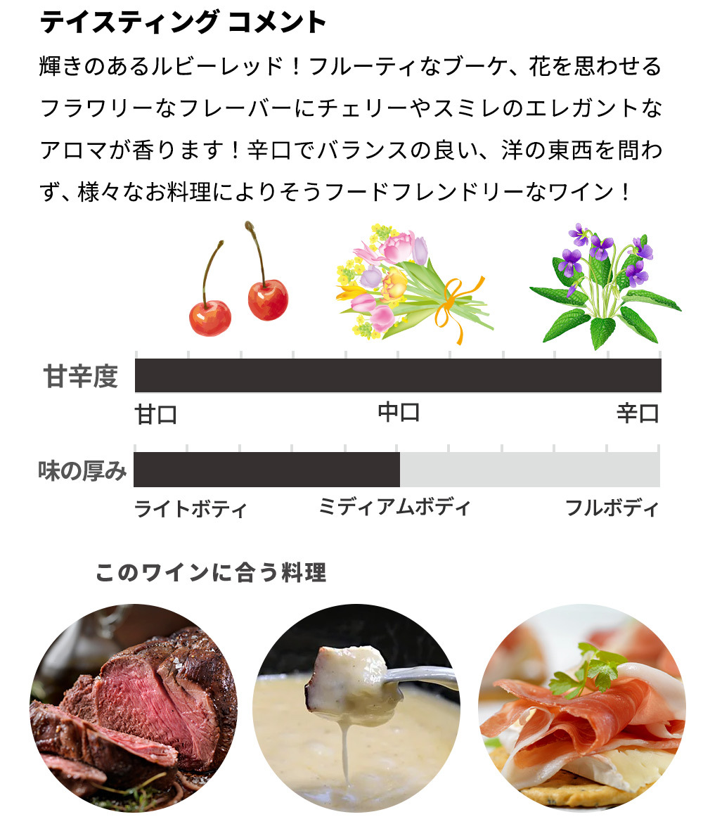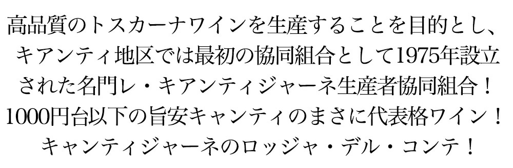 キャンティ・ロッジャ・デル・コンテ[2023]年 ■葡萄品種:サンジョヴェーゼ90%/カナイオーロ・ネロ10% イタリアで最も売れて飲まれているレ・キアンティジャーネ社の『キアンティDOCG』 しかも造り手は、高品質のトスカーナワインを生産することを目的とし、キアンティ地区では最初の協同組合として1975年に設立されたレ・キアンティジャーネ生産者協同組合! この組合は「レ・キアンティジャーネ」という、会社名でもあるブランドを通じて、キアンティ地区の会社であること、キアンティの造り手であること、さらにキアンティに代表されるトスカーナの伝統的かつ高品質なワインの造り手であることを誇りに、日々ワイン造りを行っています。 レ・キアンティジャーネ社のキアンティDOCGワインは、2013年、2014年、2015年、2016年、2017年、2018年と6年連続で、『キアンティDOCG』最高の生産本数を誇り、売上本数も国内最高の大規模小売組織として認知されています。 フルーティなブーケ、花を思わせるフラワリーなフレーバーにチェリーやスミレのエレガントなアロマが香ります!辛口でバランスの良い、洋の東西を問わず、 様々なお料理によりそうフードフレンドリーなワイン。