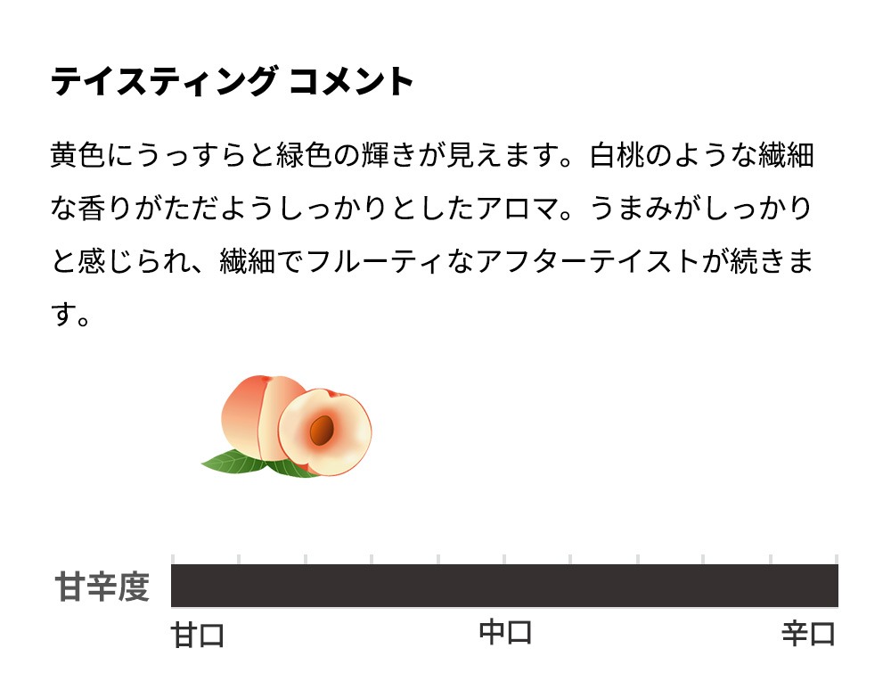 「調和のとれた仕上がり」 「しっかりとした旨みと繊細さを兼ね備えた味わい」 「前菜から食事全体を通して楽しめるスプマンテ」 白桃を思わせるアロマで飲み心地がよく、前菜からお食事全体を通してお楽しみいただけます。しっかりとしたうまみと繊細さを感じるアフターテイスト。