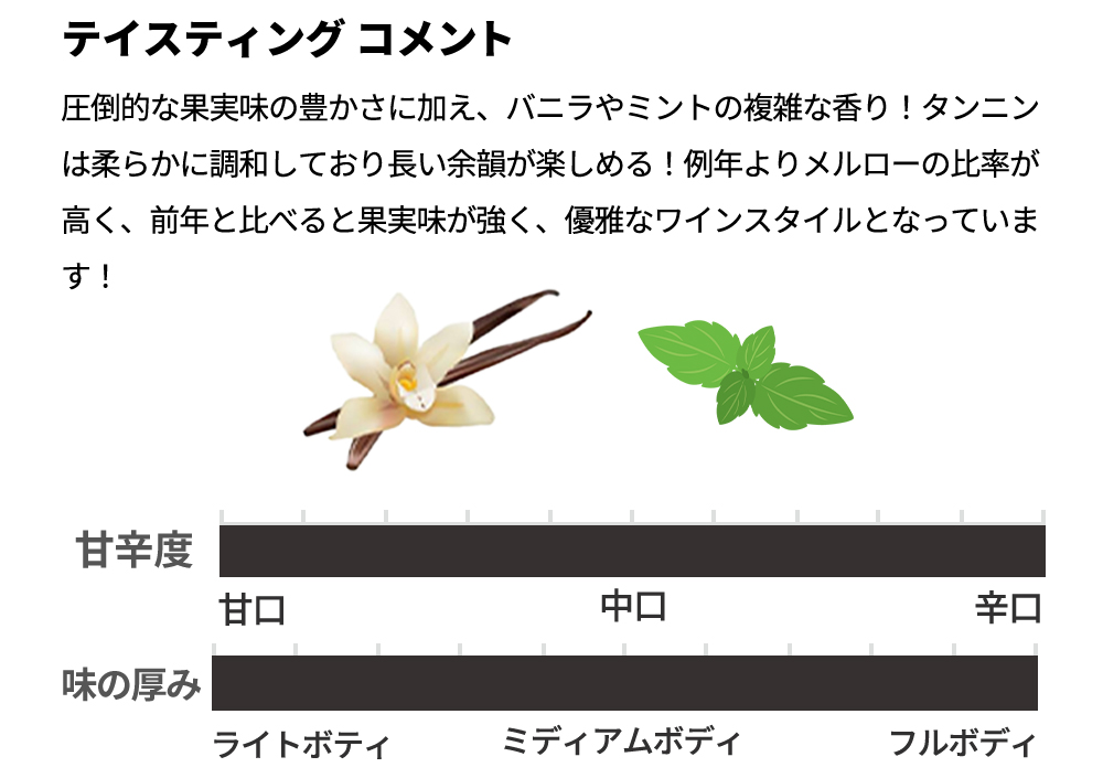 圧倒的な果実味の豊かさに加え、バニラやミントの複雑な香り!タンニンは柔らかに調和しており長い余韻が楽しめる!例年よりメルローの比率が高く、前年と比べると果実味が強く、優雅なワインスタイルとなっています!