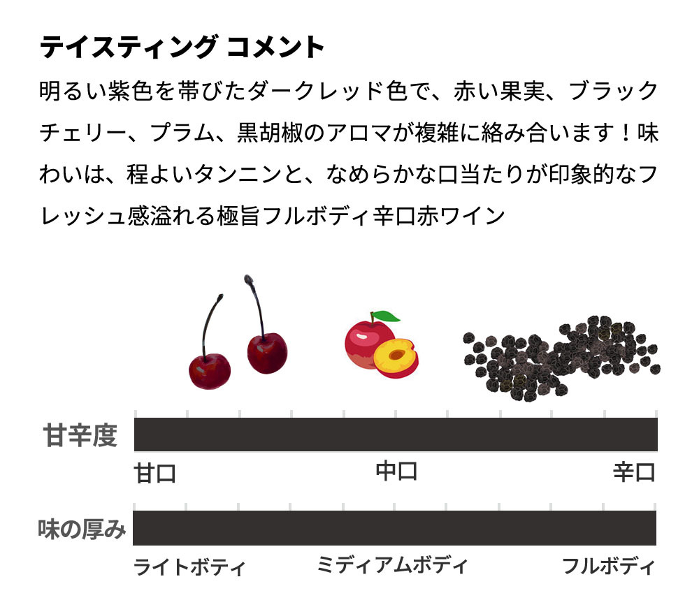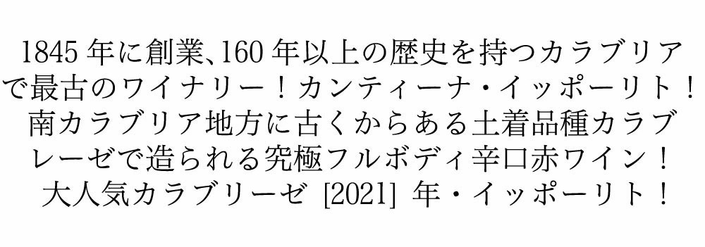 カラブリーゼ[2021]年・イッポーリト・IGTカラブリア ■ぶどう品種:カラブレーゼ100% ■適温: 18℃前後 ■料理: 地中海料理 ■アルコール度数: 14度 ■発酵・熟成:23℃の温度管理の下発酵を行い、7ヶ月間ステンレスタンク内で熟成 造り手のイッポーリトは、チロの土着品種にこだわってワイン造りを行うカラブリアで最も歴史あるカンティーナ!1845年に創業、160年以上の歴史を持つイッポーリトワイナリーは、カラブリアで最古のワイナリー! 南カラブリア地方に古くからある土着品種カラブレーゼを使用したワイン。明るい紫色を帯びたダークレッド色で、赤い果実、ブラックチェリー、プラム、黒胡椒のアロマが複雑に絡み合います。味わいは、程よいタンニンと、なめらかな口当たりが印象的なフレッシュ感溢れるワインです!