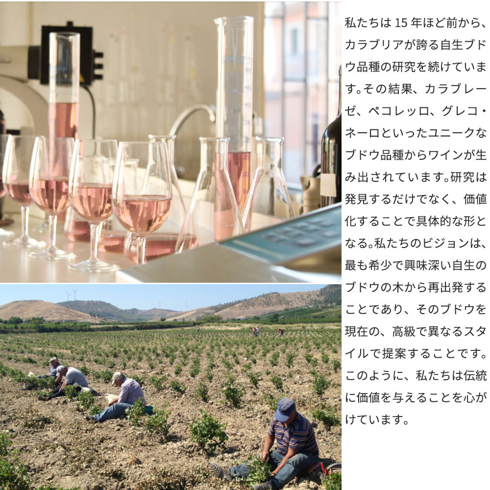 ガリオッポ、グレコビアンコ、カラブレーゼ、ペコレッロ、そしてグレコネロなど、自生するブドウの回復と価値を高めることを常に使命としてきたのである。常に研究を重ね、革新的な技術を用い、すべての生産工程を直接管理することで、私たちのワインにはエレガントさ、独占性、そして私たちの土地との同一性が追求されているのです。