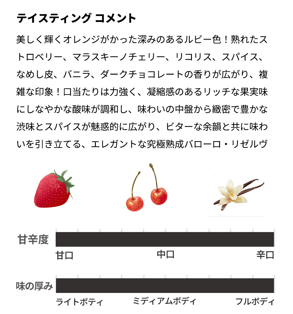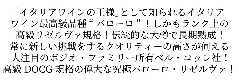 バローロ リゼルヴァ 10アンニ 2013 ベル コッレ社 DOCGバローロ リゼルヴァ 飲み頃11年熟成作品 ■栽培:リュット・レゾネ(減農薬農法) ■熟成:48ヶ月熟成 造り手は、海外の評論家から注目を集める若き当主ルカ・ボジオ氏!ピエモンテにてルカ・ボジオ氏の両親が1967年から行っていた農業を引き継ぎ設立したボジオ・ファミリー・エステート! ベル・コッレは、バローロの伝統派として知られていましたが、1980年にボジオ・ファミリー・エステートの傘下に入り、リュット・レゾネ(減農薬農法)や醸造設備への投資などの大改革を行い人気も品質も急上昇し、ワイン評論家も大注目! 美しく輝くオレンジがかった深みのあるルビー色! 熟れたストロベリー、マラスキーノチェリー、リコリス、スパイス、なめし皮、バニラ、ダークチョコレートの香りが広がり、複雑な印象! 口当たりは力強く、凝縮感のあるリッチな果実味にしなやかな酸味が調和し、味わいの中盤から緻密で豊かな渋味とスパイスが魅惑的に広がり、ビターな余韻と共に味わいを引き立てる、エレガントな究極熟成バローロ・リゼルヴァ!