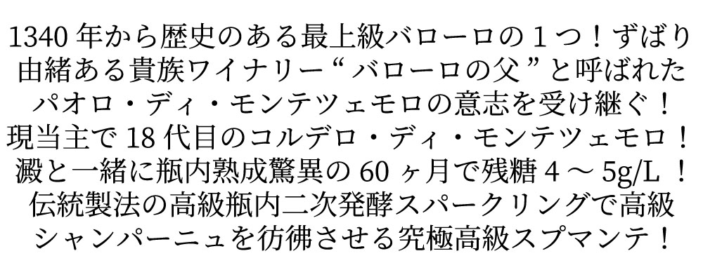 コルデロ ディ モンテツェモロ ヴィアヴェンティ ブリュット スプマンテ ディ カリタ メトッド クラッシコ 瓶内二次発酵方式 高級泡 ■ぶどう品種:シャルドネ 80%&ピノ・ネロ20% ■発酵:ステンレスタンクとフランス産100%樽 ■熟成:澱と一緒に瓶内熟成60ヶ月 ■残糖:4~5g/L 高級シャンパーニュ方式・辛口スプマンテ愛好家大注目! 造り手は1340年からの歴史を誇る、バローロに唯一残る貴族階級所有のワイナリーで、将軍だったファレッティ家との婚姻で貴族となった由緒正しい家系で“バローロの父”と呼ばれた、パオロ・ディ・モンテツェモロの後、現当主のアルベルト氏で19代目(ちなみにフェラーリの社長ルカ・ディ・モンテツェモロとは親戚関係!) ルミュアージュやデゴルジュマンも全て手作業100%で行なわれる伝統製法の高級瓶内二次発酵スパークリングで高級シャンパーニュを彷彿させるきめ細かいクリーミーな泡と深いコク! フルボディでドライフルーツ、パイナップル、アップルと蜂蜜のアロマが特徴の人気辛口高級スプマンテが限定で少量入荷!