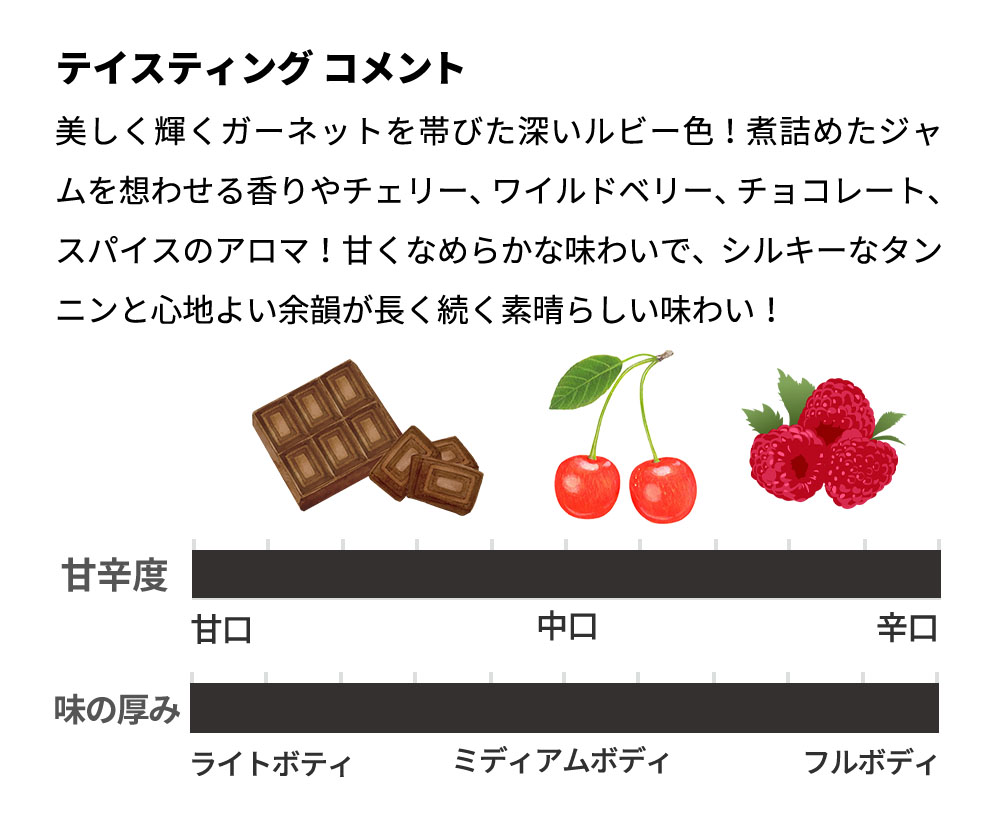 煮詰めたジャムを想わせる香りやチェリー、ワイルドベリー、チョコレート、スパイスのアロマ!