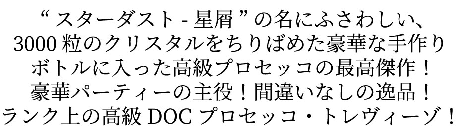 【豪華ギフト箱入り】ボッテガ スターダスト プロセッコ DOCプロセッコ トレヴィーゾ グレーラ種 100% 正規品 ロットナンバー入り 白 ■ぶどう品種:グレーラ種(プロセッコ種)100% ■樹齢:40-80年 ぶどう畑に自生する酵母を自家培養したものを用いキュヴクローズで約40日、果汁に直接炭酸発酵とシュール・リー熟成をほどこし、素材の良さの生きた香り高い力強いスプマンテに仕上げられます! 力強いぶどうの香味を生かすために、果汁を直接、地場産酵母を用いキュヴクローズ(密封タンク)で約40日かけて発酵熟成させる一元発酵の低温シャルマ方式でやや糖度の高いドライスプマンテに仕上げています!(発酵、熟成ともに約14度という低温で行うことで、ぶどう自体の持つ豊かな香り成分、ミネラル分際立たすとともに、ゆっくりと炭酸をワインに溶け込ませて独特の細やかでシルキーなペルラージュを実現しています。) アペリティフに。魚介料理とくに伊勢海老、カニなど甘みのある甲殻類!酢飯との相性も抜群なので、生寿司やちらし寿司にもおすすめ!