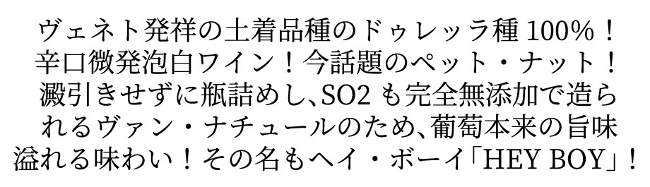 ヘイ ボーイ フリッツァンテ ビアンコ ペット ナット 2022 オールド ボーイ ワイン IGTヴェネト 自然派 ペティアン ナチュレル ■ぶどう品種:ドゥレッラ種100% 自然派・ナチュラル・スパークリングワイン(ペティアン・ナチュレル(Petillant Naturel))ペット・ナット愛好家大注目! 澱引きせずに瓶詰めし、SO2も完全無添加で造られるヴァン・ナチュールのため、葡萄本来の旨味溢れる味わい! ペット・ナットは「ペティアン・ナチュレル(Petillant Naturel)」の略で一次発酵の途中で瓶詰めを行い、残った糖分のみで瓶内二次発酵を起こします! 比較的アルコール度数も低めで飲みやすく、軽やかでフレッシュな味わいが特徴です!