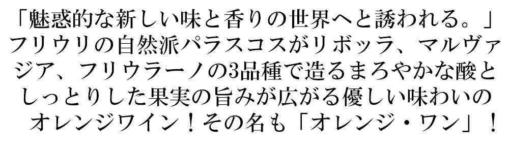 フリウリの自然派パラスコスがリボッラ、マルヴァジア、フリウラーノ3品種で造るオレンジワイン!まろやかな酸としっとりした果実の旨みが広がる優しい味わいのオレンジワイン!