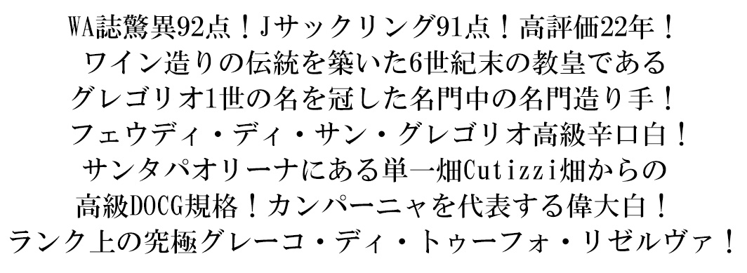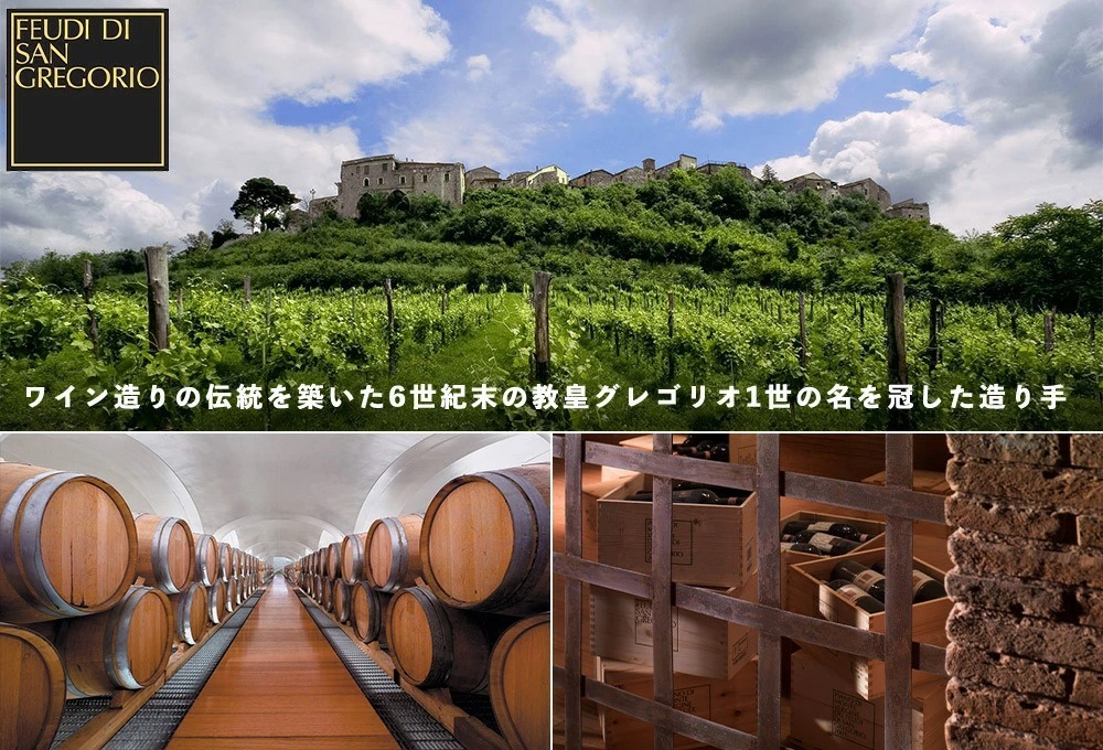 【「フェウディ・ディ・サン・グレゴリオ」は、イタリアはカンパーニャ州にて、土着品種のアリアーニコを大化けさせた「タウラージ」「セルピコ」などを世に送り出し、ガンベロ・ロッソ等で高い評価を獲得している有名なカンティーナです。カンパーニア州の旧アッピア街道沿い一体にブドウ栽培を奨励し、ワイン造りの伝統を築いた6世紀末の教皇グレゴリオ1世に敬意を表し、“フェウディ・ディ・サン・グレゴリオ(聖グレゴリオの領地)”を社名に冠しています。【土壌と地元のブドウ品種にこだわって、最新テクノロジーと農学研究を駆使し、類まれなる高品質ワインを生み出しています。その業績は従来のカンパーニア・ワインのイメージを刷新するだけでなく、イタリアワインの新潮流となっています。土着のブドウに深い愛情を寄せ、イタリアのみならず世界中から熱い視線を浴び続けている造り手として、その一挙手一投足からは目が離せません。【アヴェッリーノ県“イルピニア”地区を中心に自社畑を所有しているフェウディ・ディ・サン・グレゴリオ社は、~恵まれた気候風土~山岳・丘陵地帯、平地、河川などが入り組んだ非常に複雑な環境。風通しがよく、日照量が多い独特の微気候(ミクロクリマ)古くからの堆積層とヴェスーヴィオ火山灰で構成される火山灰、凝灰岩、粘土、砂などを多く含む肥沃な土壌ティレニア海から東へ約20km内陸に入った、昼夜の寒暖差が激しい山岳地帯(海抜350~600m)~最新テクノロジーを駆使して~気象学に基づき降雨量や風、ブドウの葉の湿度まで詳細な情報をデータ化するための自動監視システムミラノ大学との土壌・ブドウの共同研究 (テンドーネ式からグイヨー式、コルドーネ式の採用)ゆっくりと完熟し、ミネラル分豊富で、糖度、酸のバランスがとれた、優秀なブドウを育てる事に成功しています。また、フェウディ・ディ・サングレゴリオ社はバジリカータとカンパーニアに2つのミシュラン1つ星レストランを所有し、食文化の啓蒙にも努めています。【マット・クレイマー氏は著書「Making Sense of Italian Wine」の中で「当代カンパーニアの雄ともいうべき生産者、フェウディ・ディ・サン・グレゴリオは、ほとんど何を作らせても絶妙なタッチを見せるかのようで、タウラージもその例にもれない。18ヵ月をオーク小樽で過ごすタウラージのリゼルヴァ、ピアーノ・ディ・モンテ・ヴェルジーネは、断固たるオーク風味をもつが、深い果実味は重厚そのもので、しかもなお端正さを失わず、ミネラルも感じさせる。現代タウラージの名品のひとつといえる。」