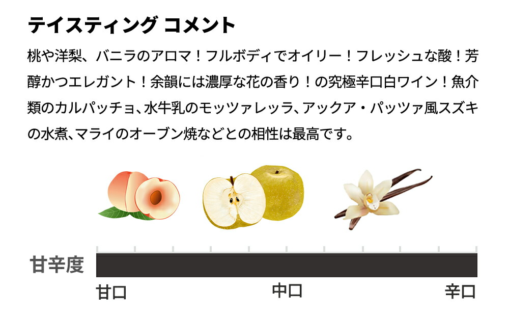 「ピリ辛のわさびソースを添えた生魚やマグロのタルタルにぴったり。ステンレス・スティールだけで造られるこのワインは、洋ナシ、カリン、ハニーデュー・メロンのたっぷりとしたアロマを支える繊細なパワーと堅さを備えている。ワインのミネラルの特徴は非常に発達している。」