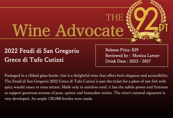 ヴィノス誌90点で「2022年のグレコ・ディ・トゥーフォ・キュティッツィは、甘い白い花、カモミール、砕いたリンゴの香りから始まる。熟した果樹園の果実とグリーンメロン、塩味とミネラルのトーン、刺激的な酸味のバランスが取れている。2022年は塩辛い緊張感とネクタリンのニュアンスで締めくくられる。」