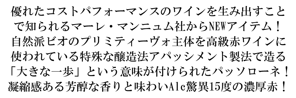 パッソローネ・アッパッシメント・NV・マーレ マンニュム社 大きな一歩といった意味の「パッソローネ」という名が付けられたフルボディ赤ワイン。古木のプリミティーヴォ主体。フレンチオーク樽とアメリカンオーク樽で6ヶ月熟成。 芳醇な香りと味わいのワインで、熟した果実とチョコレートのアフターテイストにチェリーリキュールのニュアンスが感じられるフルボディ辛口赤ワインが限定で正規品で少量入荷!グリルした肉やジビエ、チーズとの相性は抜群です!