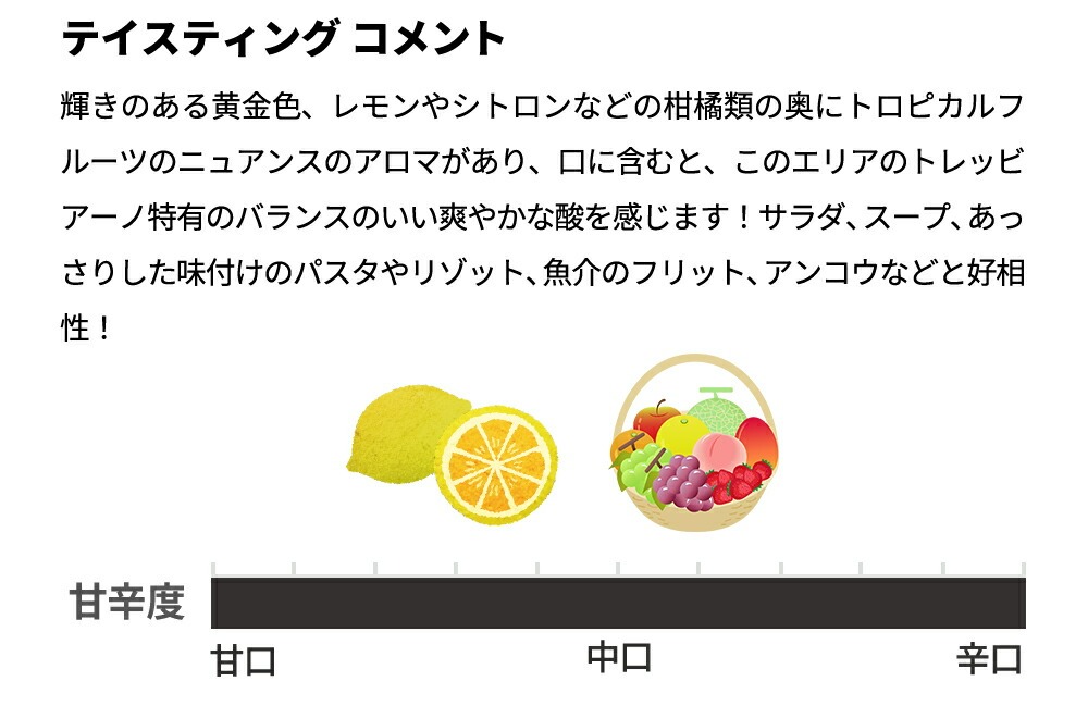 このワインは、輝きのある黄金色、レモンやシトロンなどの柑橘類の奥にトロピカルフルーツのニュアンスのアロマがあり、口に含むと、このエリアのトレッビアーノ特有のバランスのいい爽やかな酸を感じます!