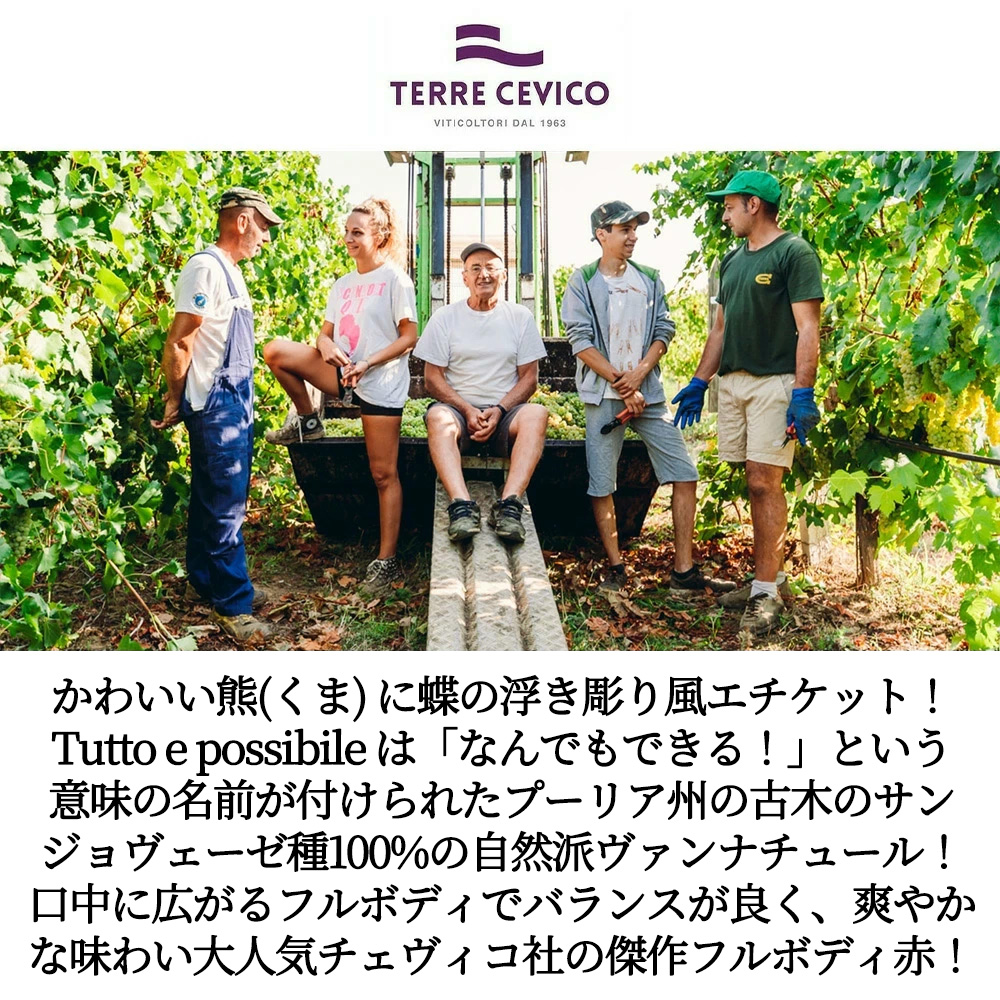 イタリアフルボディ辛口赤ワイン愛好家大注目!エミリア・ロマーニャ州の自然派・オーガニック・サンジョヴェーゼ100%辛口赤ワイン愛好家大注目!イタリアンレストラン様大注目!自然派・SO2無添加のヴァンナチュール愛好家も大注目!エミリア・ロマーニャ州リミニの自然派・オーガニック(ユーロリーフ認証)の畑からのサンジョヴェーゼ種100%で造られるTutto e possibileは「なんでもできる!」という意味の名前が付けられた自然派辛口赤ワイン!(限界を超えて新たな挑戦を楽しむ人のために、というメッセージが込められている。)造り手は今やロマーニャ全域のワインを製造するイタリアを代表する会社となったCE.VICO社!2000年以上もの間、トスカーナとロマーニャの間の、絵画のように美しいアベニン丘陵に広がる葡萄栽培に最適な土地でワインを製造していた生産者たちが、1950年代前半に彼らの経験を集め、共同でワインを造り始めたことに起源を持つ、チェビコ社!の自然派・オーガニック(酸化防止剤SO2無添加)辛口フルボディ赤ワイン!エミリア・ロマーニャ州リミニの畑からのサンジョヴェーゼ種を除梗しブドウは破砕せず、色とアロマの抽出を最適化するために果皮をそのまま残し、約25℃にコントロールされた温度で8~10日間発酵!発酵の初期段階で、アロマと柔らかなタンニンの調和を得るために、頻繁にポンピングオーバーとデレスタージュ!澱引き後、厳選された酵母を加えマロラクティック発酵で造られる、鮮やかなルビーレッドで、魅力的なチェリーやブラックベリーの香りが口の中に広がるフルボディでバランスが良く、さわやかな味わい!ステンレスタンクで発酵後、澱とともに熟成!酸化防止剤を使用せずに造られたフルボディ辛口赤ワインです!ボロネーゼなどの肉系パスタ、サラミ、半熟成チーズや炭焼きの赤身肉との相性バッチリ!しかもかわいいクマに蝶の浮き彫り風のきれいなラベルで正規品で限定少量入荷!