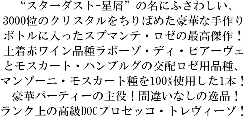 “スターダスト-星屑”の名にふさわしい、3000粒のクリスタルをちりばめた豪華な手作りボトルに入ったスプマンテ・ロゼの最高傑作!豪華パーティーの主役!間違いなし!高級クラブ様はじめナイト系のお店からのお問い合わせ殺到の人気高級スパークリング・ロゼ・スパークリングが3000粒のクリスタルをちりばめた豪華な手作りボトルに入った、ボッテガ・スターダストのロゼバージョン!さらに豪華ギフトボックスに入れられ正規品で限定少量入荷!