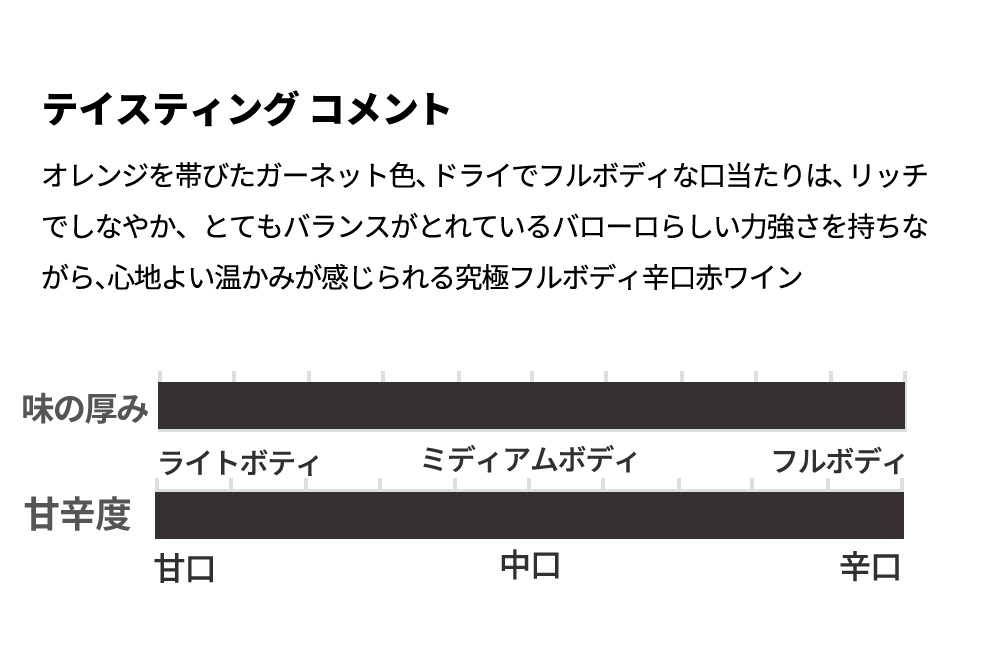 ■葡萄畑面積:20ha(ロベルト・サロット家の自社畑) オレンジを帯びたガーネット色、ドライでフルボディな口当たりは、リッチでしなやか。