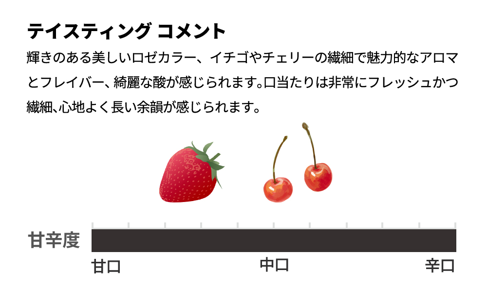 輝きのある美しいロゼカラー、イチゴやチェリーの繊細で魅力的なアロマとフレイバー、綺麗な酸が感じられます。