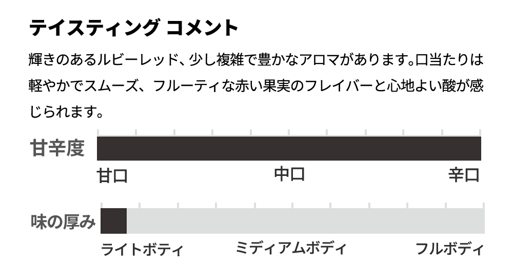 口当たりは軽やかでスムーズ、フルーティな赤い果実のフレイバーと心地よい酸が感じられます。ラベルは、グリム童話「赤ずきん」をモチーフにしています。