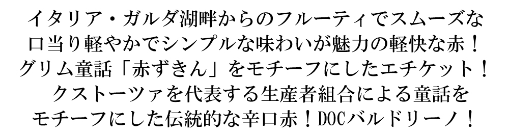 クストーツァを代表する生産者組合による童話をモチーフにした伝統的な辛口赤ワイン!フルーティでスムーズな口当り軽やかでシンプルな味わいが魅力の軽快な赤ワイン!