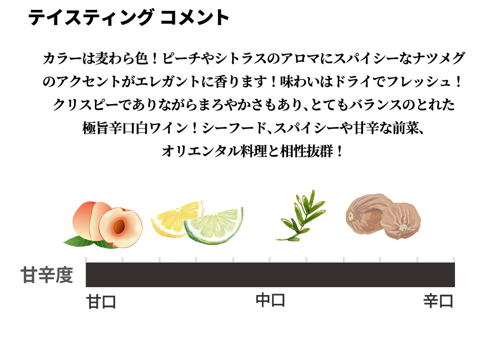 クリスピーでありながらまろやかさもあり、とてもバランスのとれた極旨辛口白ワイン!シーフード、スパイシーや甘辛な前菜、オリエンタル料理と相性抜群!ボトルにはブドウの小枝を結び付け、軽量化したボトルに詰められています!