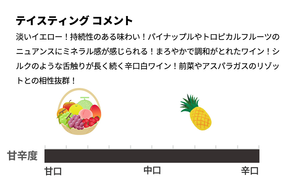 黄桃、アカシア、ライムピールとアロマティックなハーブの香りは熟成とともにミネラルや塩味を生み出します!フレッシュで生き生きとしたエレガントな口当たりで、バランスのとれた酸が特徴の一度飲んだら忘れることができない個性を持った究極辛口白ワイン!
