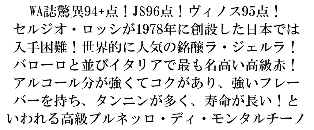 アルコール分が強くてコクがあり、強いフレーバーを持ち、タンニンが多く、寿命が長いといわれる、高級辛口フルボディ赤ワイン!ブルネッロ・ディ・モンタルチーノ!