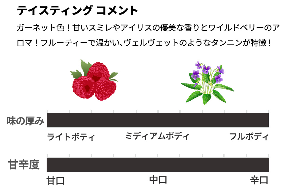 ガーネット色!甘いスミレやアイリスの優美な香りとワイルドベリーのアロマ!フルーティーで温かい、ヴェルヴェットのようなタンニンが特徴!