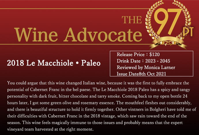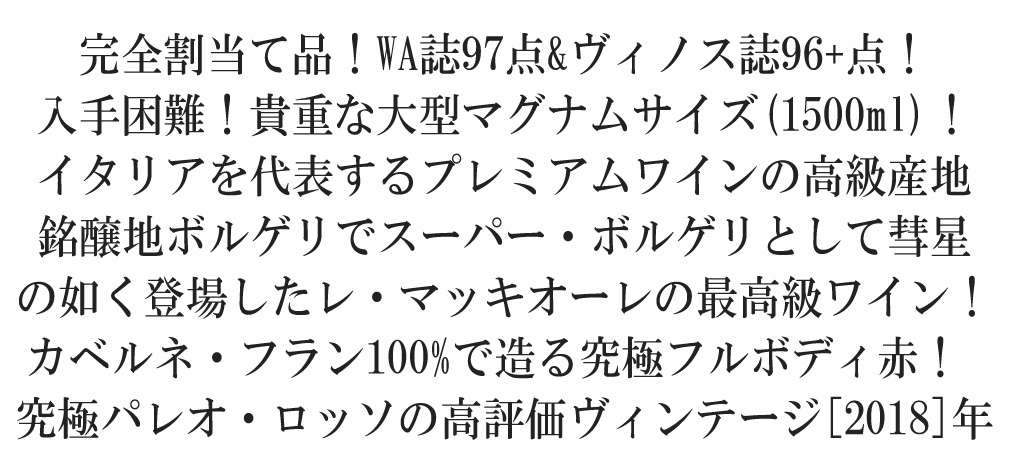 オーク樽で18ヶ月、さらに瓶で16ヶ月以上熟成された驚異の34ヶ月の熟成期間を経ている。カベルネ・フラン種100%で、ボルゲリの気候と台地を最大限に活かしている。熟成が進むとクラシックなボルゲリスタイルのカベルネ・フランになるだけでなく、国際的にも評価される品質を持つ。収穫は手間がかかりながらも、最終的には高品質のブドウを得られた。気温や気候も収穫に影響を与え、細心の注意を払いながら栽培された。