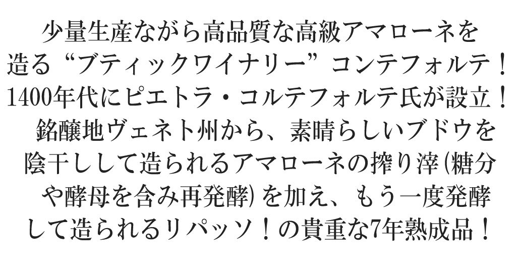 ■発酵・熟成:ステンレスタンク醗酵、翌年4月にアマローネの澱で再醗酵、フレンチオーク樽で6-8カ月熟成(新樽15%)、瓶内で最低6ヶ月熟成