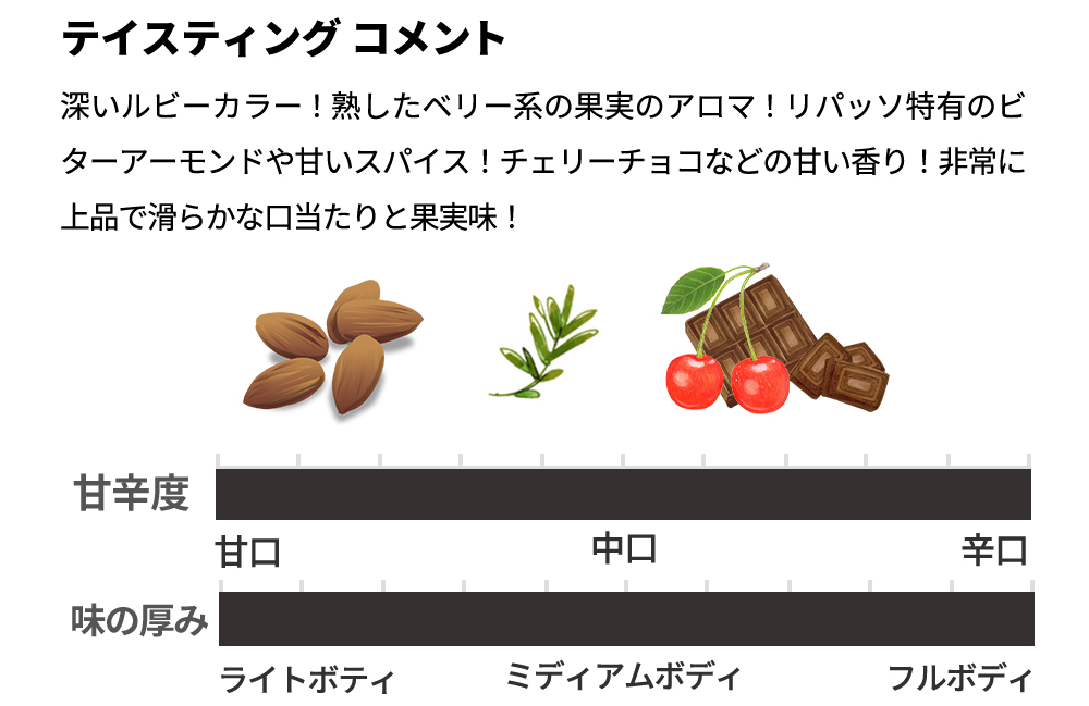 深いルビーカラー!熟したベリー系の果実のアロマ!リパッソ特有のビターアーモンドや甘いスパイス!チェリーチョコなどの甘い香り!非常に上品で滑らかな口当たりと果実味!