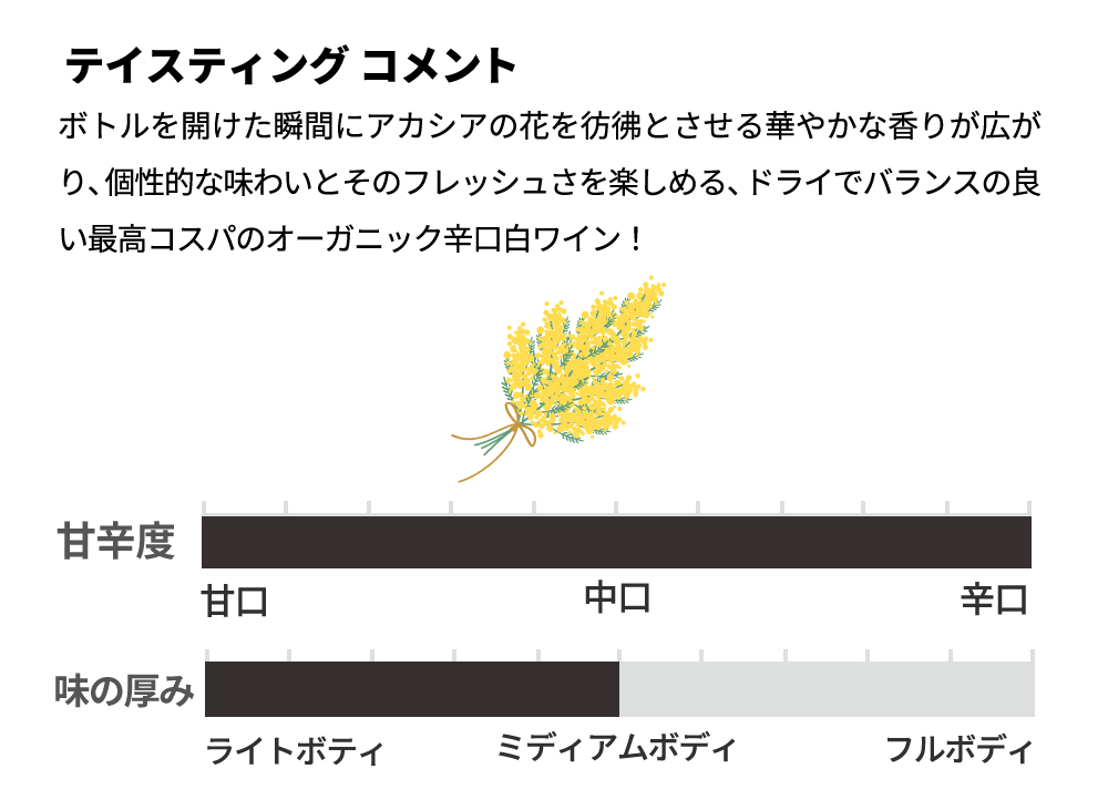 ボトルを開けた瞬間にアカシアの花を彷彿とさせる華やかな香りが広がり、個性的な味わいとそのフレッシュさを楽しめる、ドライでバランスの良い最高コスパのオーガニック辛口白ワイン!ジルベール&ガイヤール金賞受賞で待望入荷!