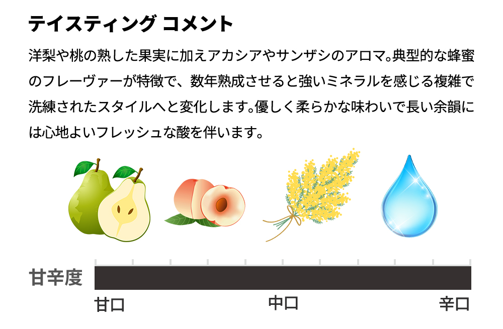 洋梨や桃の熟した果実に加えアカシアやサンザシのアロマ。典型的な蜂蜜のフレーヴァーが特徴で、数年熟成させると強いミネラルを感じる複雑で洗練されたスタイルへと変化します。