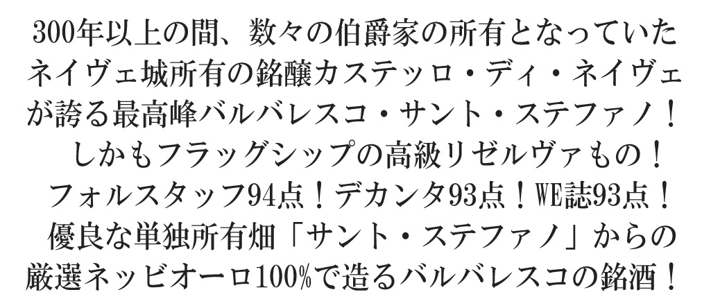 イタリア・ピエモンテ・フルボディ辛口赤ワイン愛好家大注目!高級バルバレスコファン垂涎!イタリアの偉大な赤ワインのひとつ!カステッロ・ディ・ネイヴェが誇る最高峰!サント・ステファノの高級リゼルヴァもの!