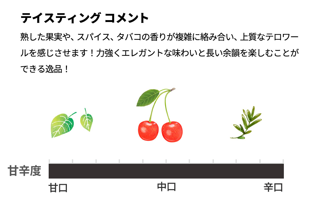 ピエモンテ地方の高級赤ワインである。ネッビオーロ種100%を用い、深みのある複雑なフレーバーとすっきりしたタンニンが特徴だ。36ヶ月のフレンチオーク樽熟成と12ヶ月以上の瓶内熟成が、熟した果実やスパイス、タバコの香りを引き出し、上質なテロワールを感じさせる。力強くエレガントな味わいと長い余韻は、このワインの魅力を一層際立たせる。