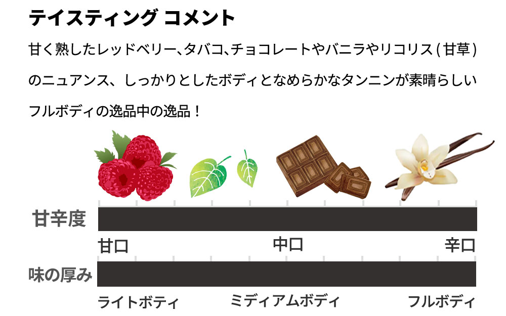 アルコール度数は15.5%で、強力なアルコール含有量を持つ。甘く熟したレッドベリー、タバコ、チョコレート、バニラ、リコリスのニュアンスがあり、しっかりとしたボディとなめらかなタンニンが特徴的なフルボディの逸品である。限定少量入荷の蔵出し正規品で、高い評価を受けている。