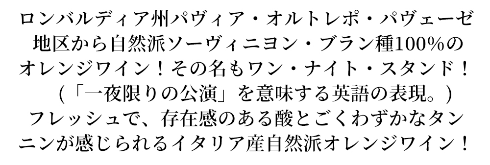 イタリア・ロンバルディア州パヴィア・オルトレポ・パヴェーゼ地区から自然派ソーヴィニヨン・ブラン種100%のオレンジワイン!その名もONS(ワン・ナイト・スタンド)!